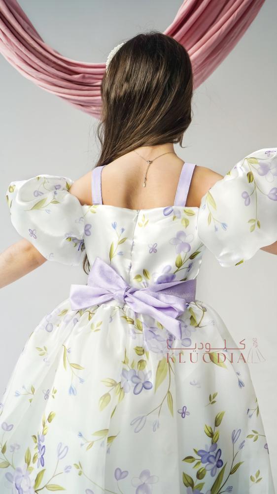 - اللون الأبيض المشجر مع وردات الموف يمنح الفستان طابعا أنيقا وعصريا في نفس الوقت إنه مزيج مثالي بين الرقة والفخامة مما يجعل طفلتك تتألق بإطلالة فريدة ومميزة