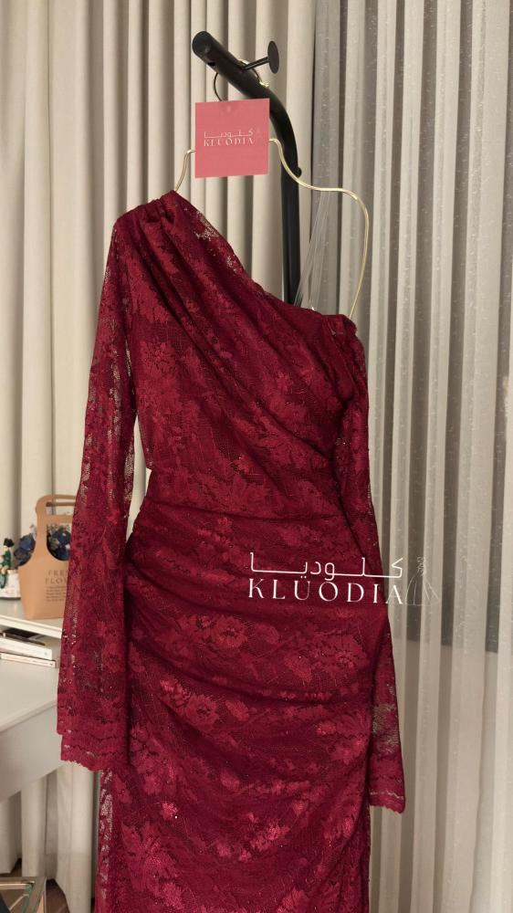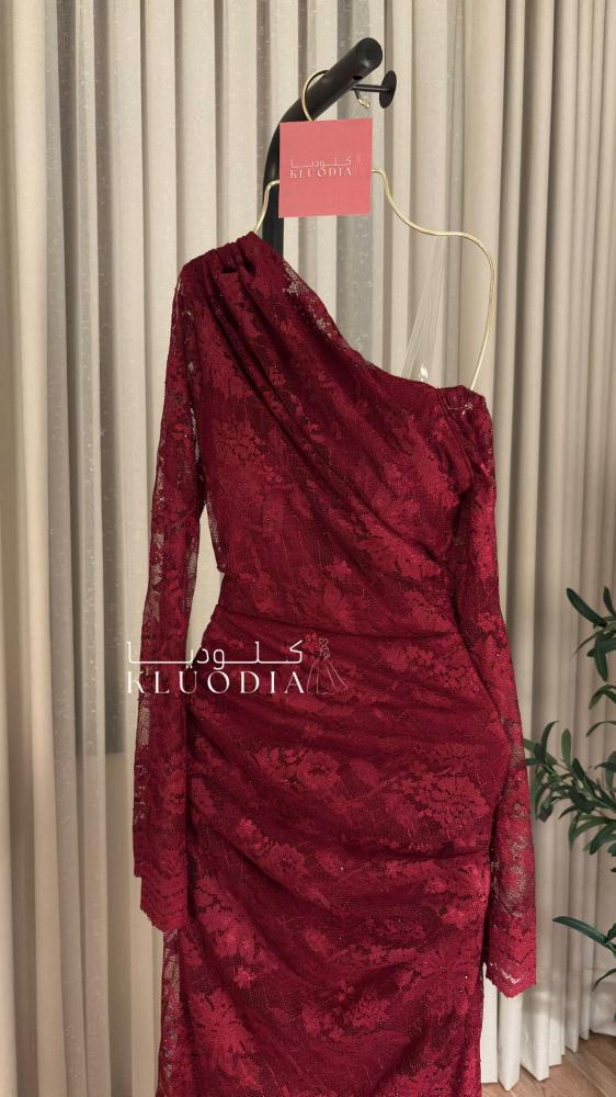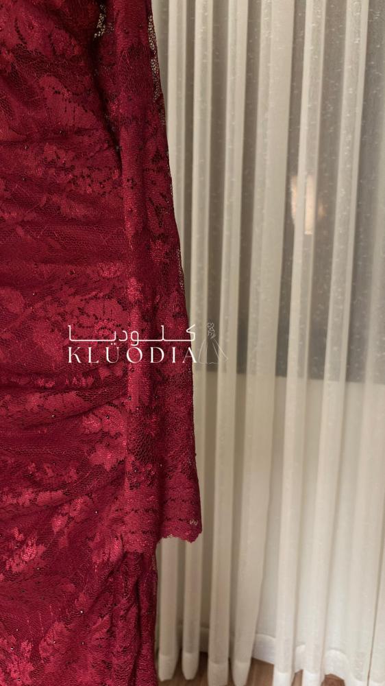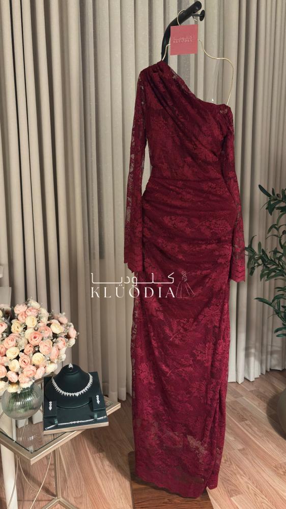 • فستان برغندي طويل مزين بتفاصيل دانتيل دقيقة تضفي لمسة من الفخامة على إطلالتك أثناء السهرة