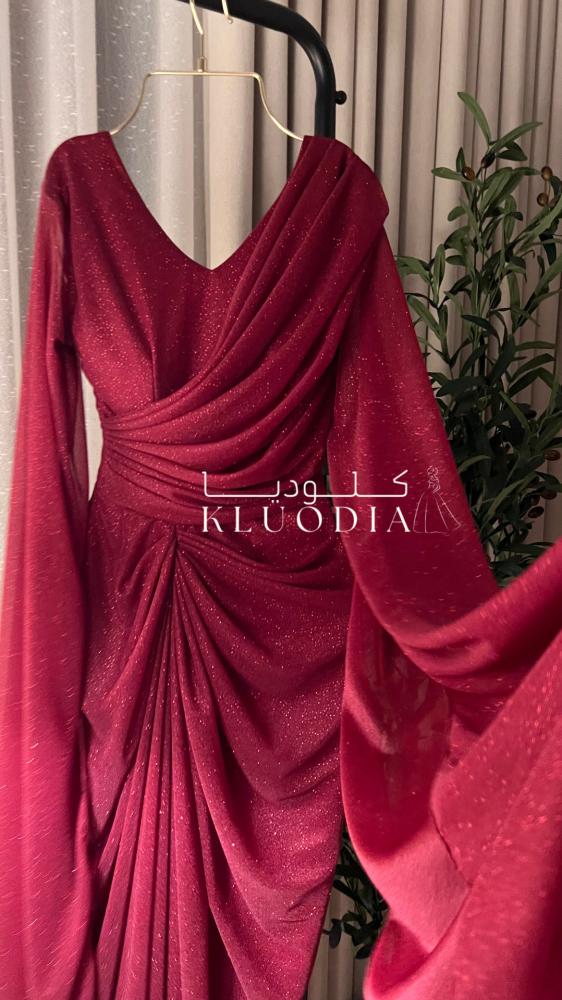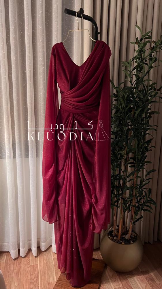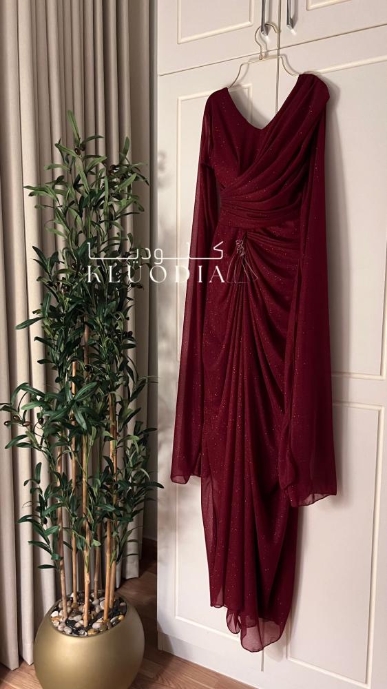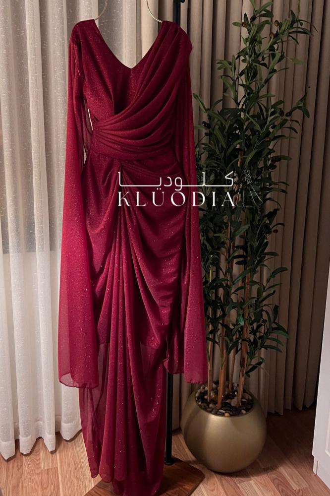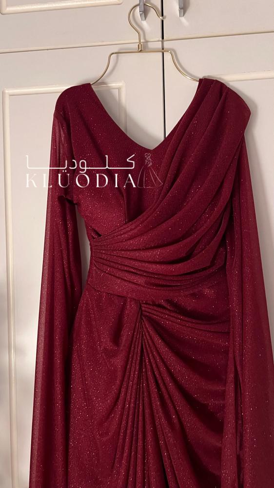 فستان مناسبات سهره لامع لون عنابي ب اكمام طويله واسعه