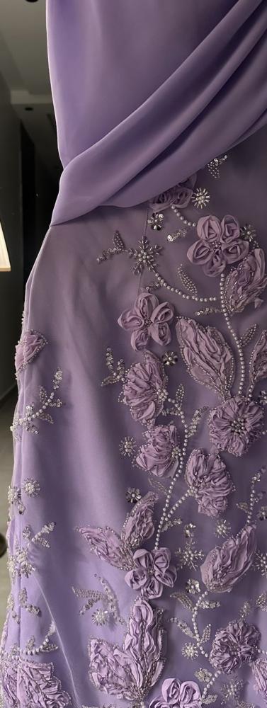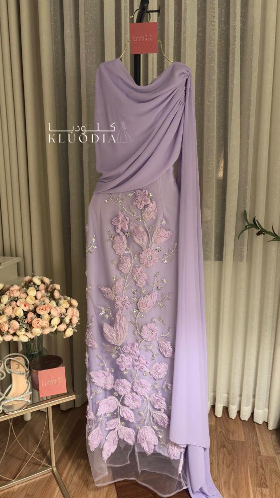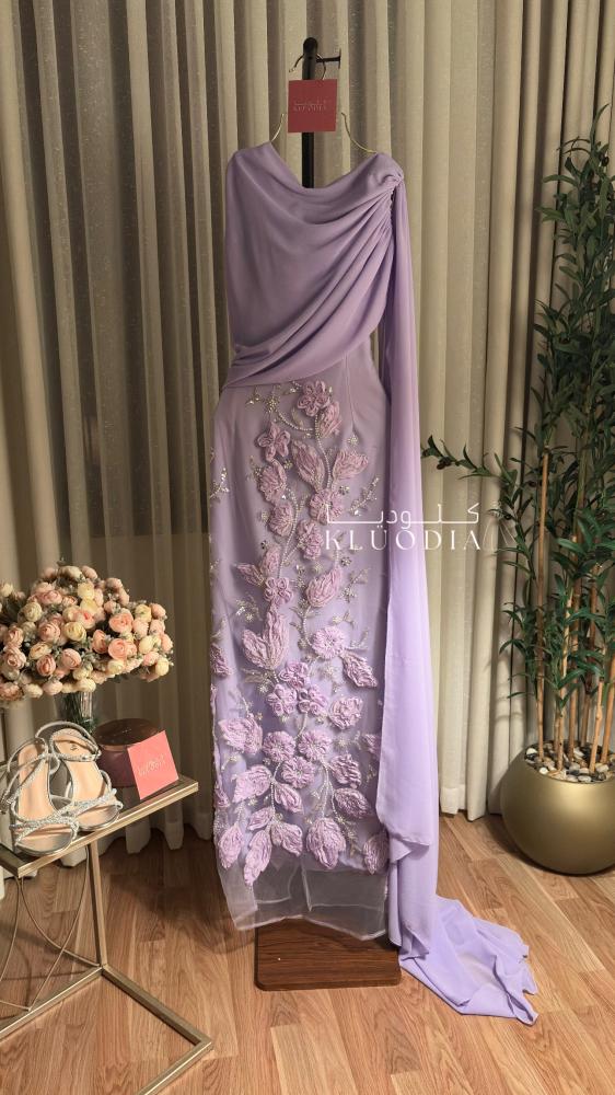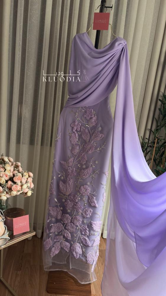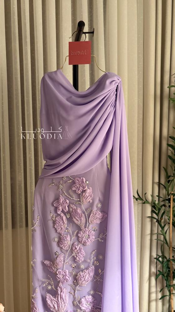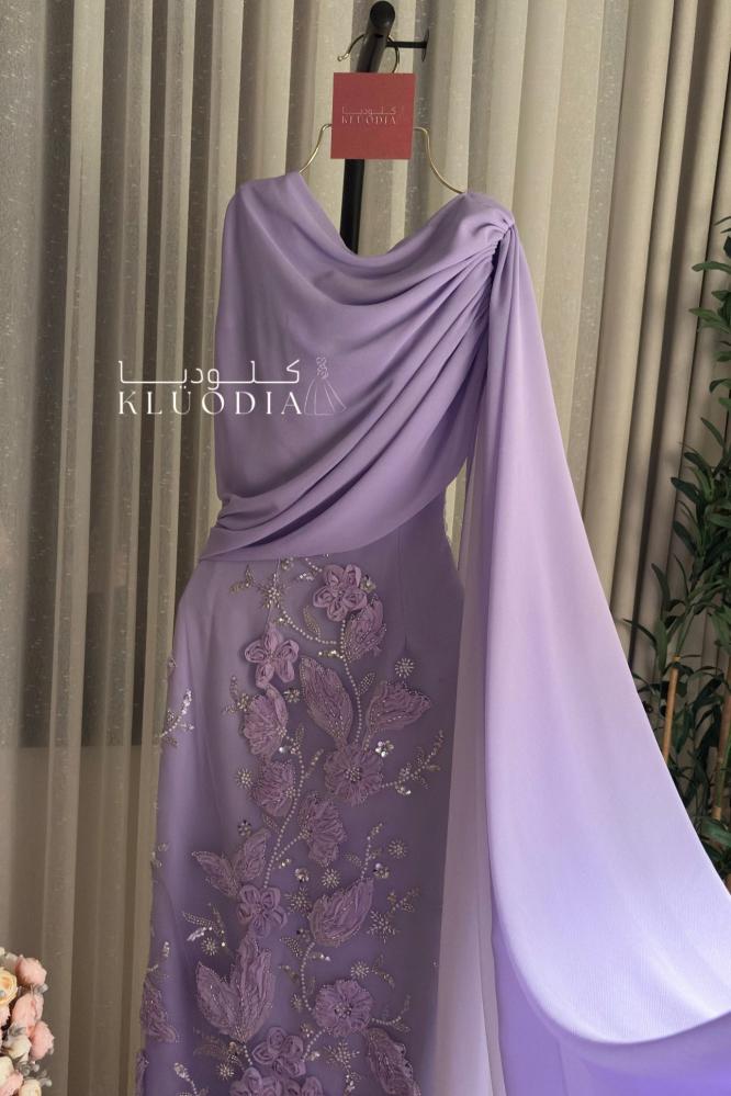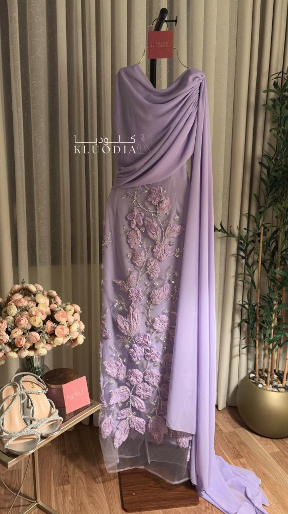 - الاسم: فستان سهره ساتر مطرز موف بشال جانبي