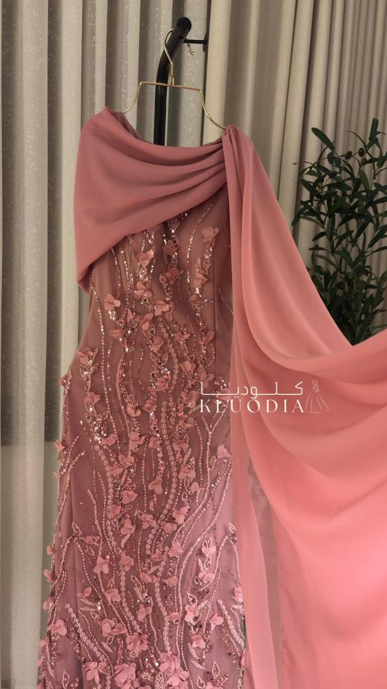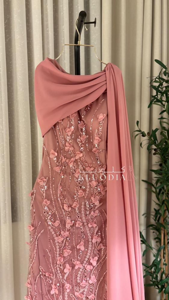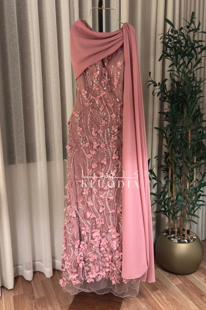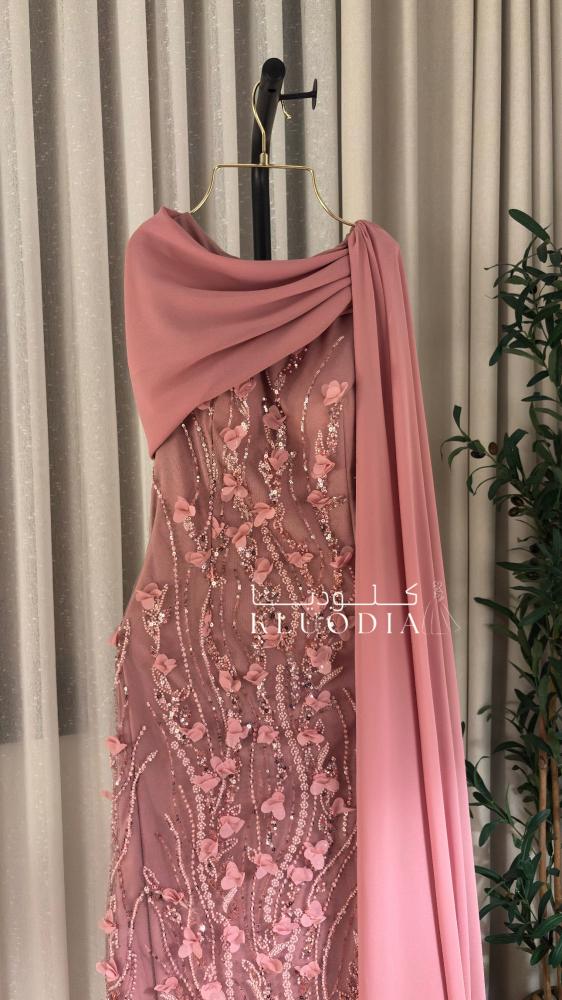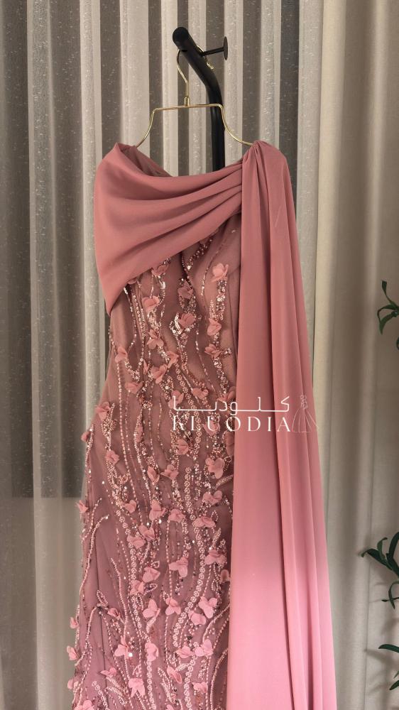 - فستان سهره فخم يتميز بقصة راقية وشال جانبي منسدل يضيف لمسة أنثوية مميزة